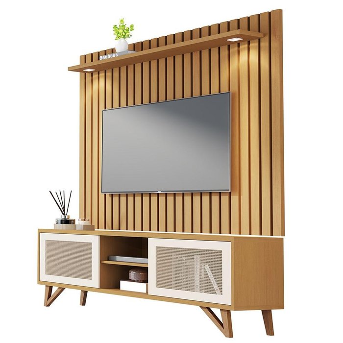 Apresentamos a você nosso conjunto de Rack Aruá com Painel Cumaru, uma combinação perfeita de estilo e funcionalidade. O design moderno e sofisticado se adapta a qualquer decoração, o amplo espaço de armazenamento interno oferece espaço para guardar os itens essenciais da sala de estar. Adicione um toque de classe ao seu ambiente! Modelo: Rack Bancada Aruá; Material da estrutura: MDP de 15 mm e 25 mm com pés em madeira maciça; Altura: 54 cm; Largura: 160 cm; Profundidade: 40 cm; Modelo: Painel Cumaru; Formato do móvel: Retangular; Material da estrutura: Painel em MDP 12 mm; ripas em MDF 12mm; prateleira em MDP 25 mm com 2 lâmpadas de led; Altura: 136 cm; Largura: 160 cm; Profundidade: 20,5 cm; Tamanho máximo de TV: até 75” Polegadas; Quantidade de portas: 02 em ratam basculante; Tipo de dobradiça: Metálica; Com puxador: Não se aplica; Quantidade prateleiras: 02; Com nichos: 02; Peso suportado do Rack: até 40,000 kg distribuídos; Peso suportado do Painel: até 25,00 kg distribuídos; Requer montagem: Sim (kit montagem incluso); Embalagem do envio: Papelão, plástico, isomanta e Isopor; Informações adicionais: - Os objetos que ambientam as fotos não acompanham o produto; - É de inteira responsabilidade do cliente a montagem do produto e/ou instalação, assim como possíveis irregularidades provenientes de manuseio inadequado; - Embora o produto acompanhe o manual de montagem, verifique a complexidade antes de decidir montá-lo sozinho, recomendamos que contrate um profissional de sua confiança; - Fique atento, nossas cores podem sofrer alterações dependendo do seu monitor; - ANTES DE MONTAR O SEU PRODUTO, verifique se há alguma peça danificada, caso esteja, prestaremos a devida assistência dentro do prazo da garantia.