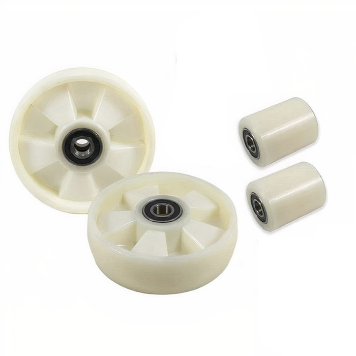 ITENS INCLUSOS: (02) Roda de carga de Nylon com rolamento (rodas da frente) - Ø80x50 mm;