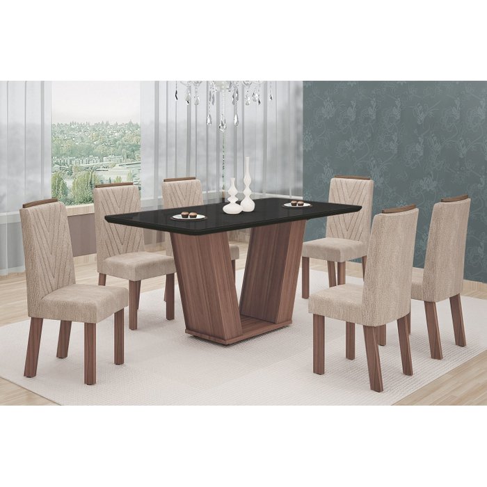 Conjunto de Sala de Jantar Tuboarte Isabel 100% MDF Tampo de Vidro Off Black com 6 cadeiras Bruna / Álamo