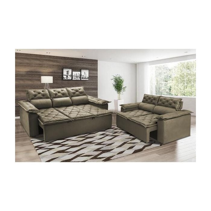 Conjunto de Sofá 3 e 2 Lugares Retrátil e Reclinável Cama Inbox Compact 2.00x1.50M Velusoft