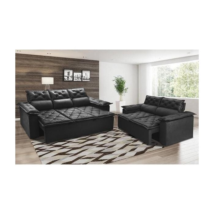Conjunto de Sofá 3 e 2 Lugares Retrátil e Reclinável Cama Inbox Compact 2.00x1.50M Velusoft Preto