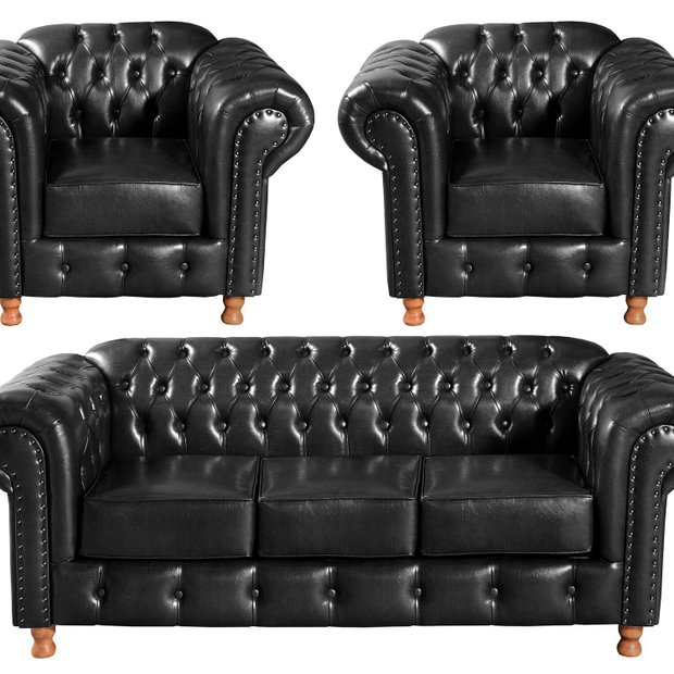 Conjunto de Sofá 3 Lugares e 2 Poltronas Chesterfield Luís Xv Preto