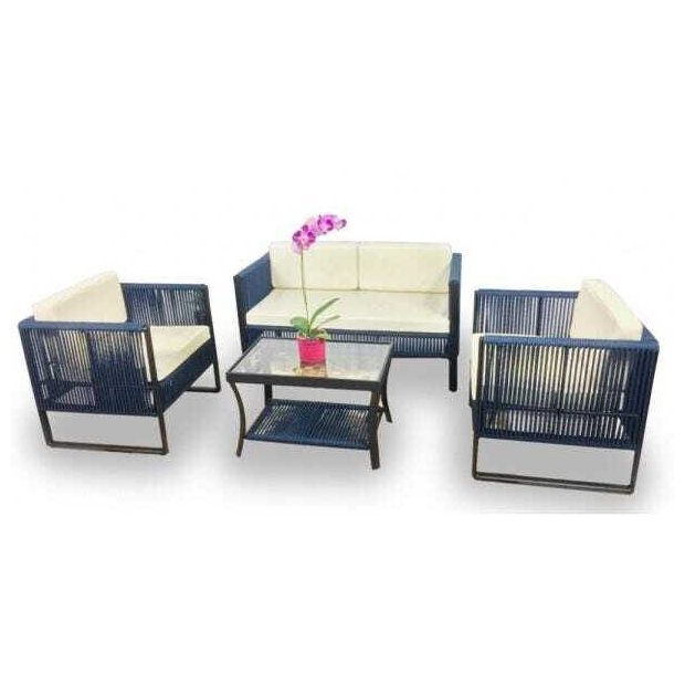 A qualidade de nossos produtos é garantida pela estrutura em alumínio reforçada com solda mig, além da técnica de pintura eletrostática. O revestimento do encosto das cadeiras é trançado em corda náutica com tratamento UV e a base dos pés da mesa e das poltronas em madeira Cumaru. Para escolher uma das opções de tecidos e cores de corda, entre em contato conosco. Conjunto composto por: 1 Sofá - Altura do assento com almofada: 44 cm Dimensões A67 x L66 x C130 cm 2 Poltronas - Altura do acento: 44 cm Dimensões A67 x L66 x C76 cm 1 Mesa de Centro Dimensões A45 x L45 x C70 cm Por se tratar de confecção artesanal, as dimensões dos produtos podem sofrer variação.