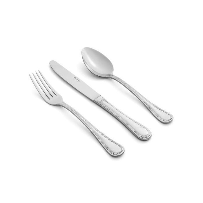 Composição:6 garfos de mesa, 6 colheres de mesa, 6 facas de mesa, 6 garfos de sobremesa, 6 colheres de sobremesa, 6 facas de sobremesa, 6 colheres de chá, 6 colheres de café.