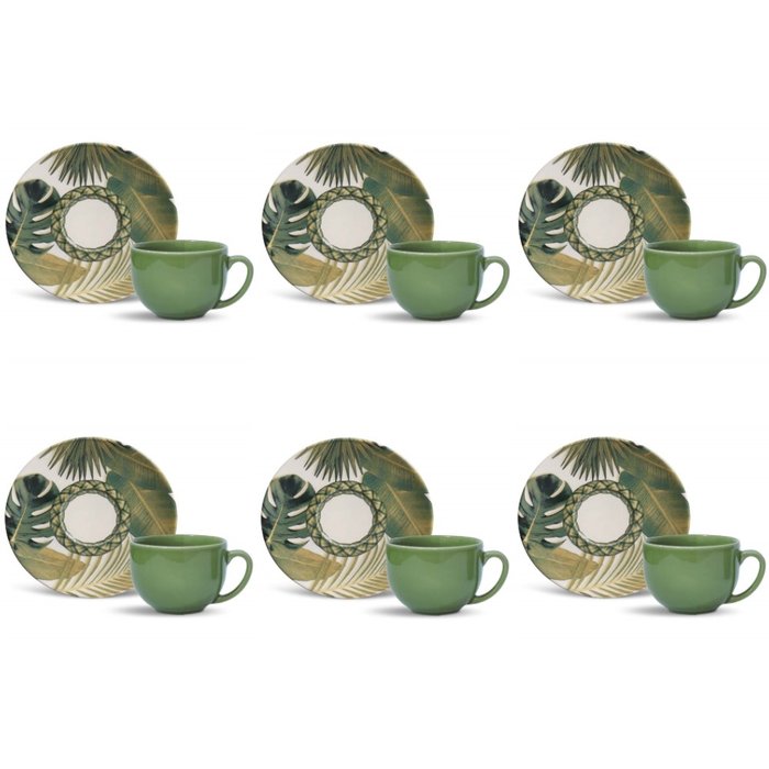 Conjunto de Xícara de Chá com Pires 06 Peças Coup Foliage Porto Brasil Conj Xícara Chá Coup Foliage Bege e verde