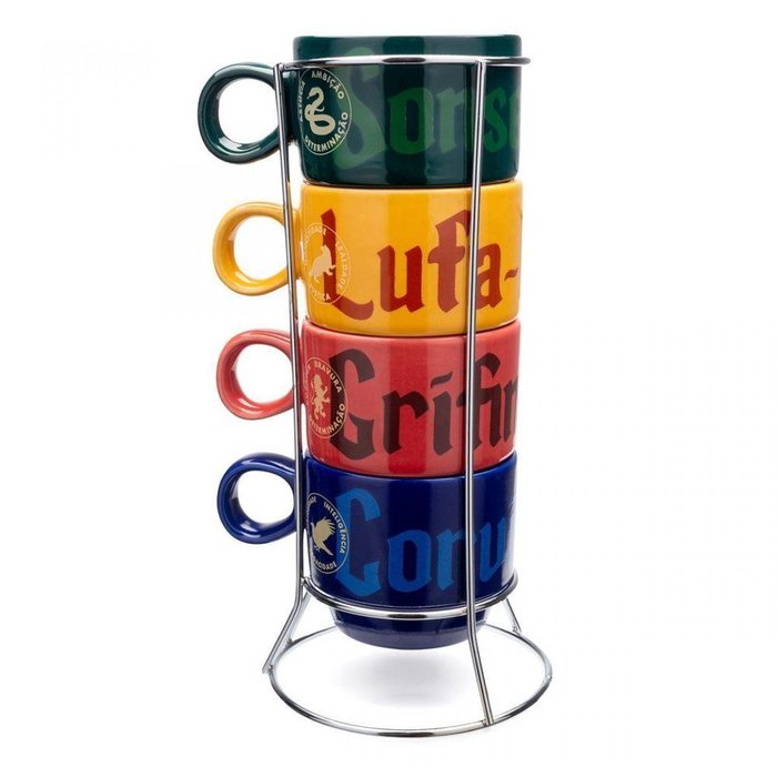Isso mesmo, este conjunto de xícaras com todas as casas de Hogwarts é perfeito pra decorar seu cantinho do café. Com suporte em metal e xícaras em porcelana, com 150 ml cada, é ideal pra um expresso (Expresso Hogwarts? Quero).