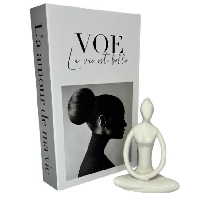 Nada mais encantador, original e inspirador do que utilizar livros na decoração de diversos ambientes, como salas de estar, escritórios, quartos, home office e onde mais sua imaginação permitir. Os livros decorativos são a mais nova tendência na decoração contemporânea e permitem diversas combinações e utilizações, dando um ar de sofisticação em mesas de centro, aparadores, prateleiras, escrivaninhas etc. Esse lindo livro estampa 'Voe', irá encantar você pela riqueza de detalhes e qualidade no acabamento, junto da mulher meditando de cerâmica na cor branca que da um toque todo especial no ambiente.