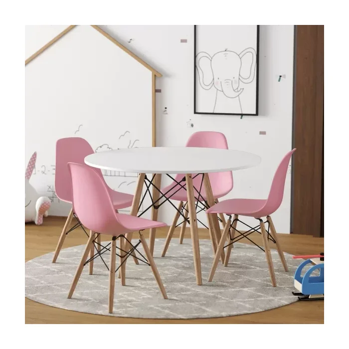 Conjunto Eames Eiffel Madeira Tampo 68cm Redondo Branco 4 Cadeiras Rosa