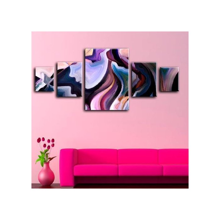 Uma tela central de 1 m de altura x 0,7 m de largura; duas telas médias de 0,56 m de largura x 0,4 m de altura; e duas telas pequenas de 0,4 m de largura x 0,3 m de altura.