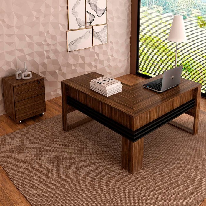 Conjunto Escritório Com Mesa em L e Gaveteiro Com Chave Cor: Nogal com Preto