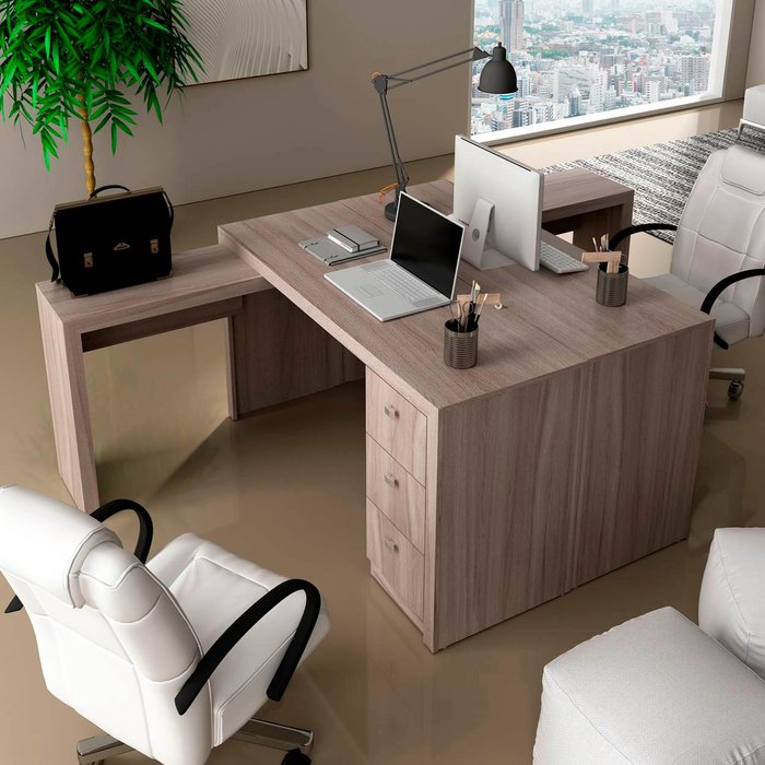 Conjunto Escritório Completo Com 2 Mesas em L e 6 Gavetas Cor: Carvalho