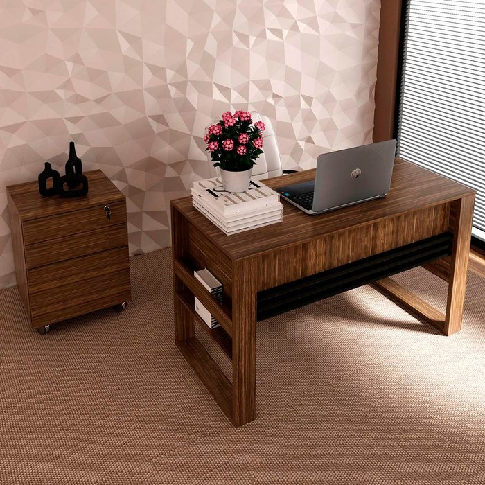 Conjunto Escritório Completo Com Mesa e Gaveteiro Volante Cor: Nogal com Preto