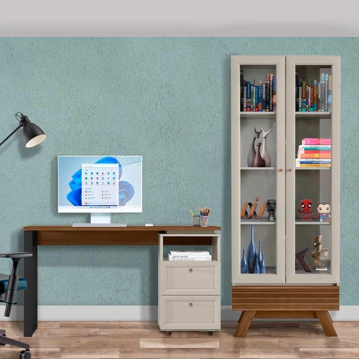 Detalhes do armário multiuso- 02 portas com vidro na parte central e dobradiças metálicas- Possui uma gaveta com detalhe ripado e corrediças telescópicas para melhor abertura- Possui 4 nichos internos para que você possa expor suas taças, copos, louças etc. com capacidade de até 5 kg em cada nicho- Puxadores em PVC na cor cobre- 04 pés em MDF- Produzido em MDF e MDP Detalhes da Escrivaninha- 02 gavetas com corrediças telescópicas- Puxadores em PVC na cor cobre- 04 pés em PVC- Produzido em MDF e MDP- Possui um pé em estilo industrial produzido em MDF recoberto- Tampo com espessura de 25 mm que suporta até 20 kg- Possui um nicho com capacidade para até 5 kg- Gaveteiro pode ser montado de ambos os lados