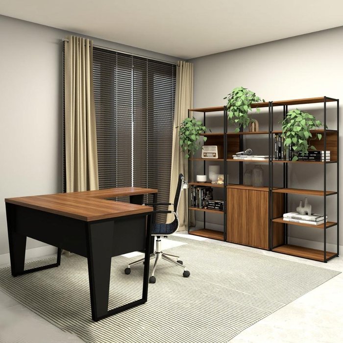 Transforme seu espaço com a versatilidade do design industrial, onde a estética moderna se encontram para criar um ambiente único, funcional e sofisticado. A combinação de três estantes industriais e uma mesa em L com gaveteiro oferece uma solução completa de armazenamento e organização, sem abrir mão do estilo e da praticidade.