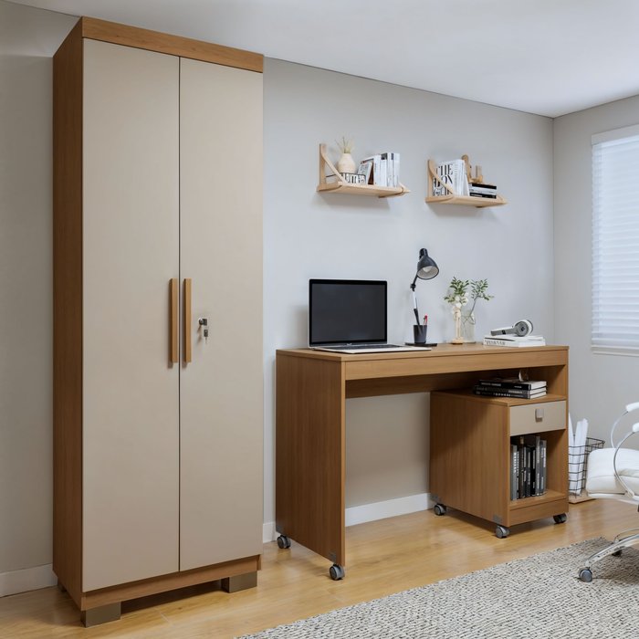 Conjunto Escrivaninha 1 Gaveta com Rodízios Giga e Armário Multiuso 2 Portas com Chave Asteca