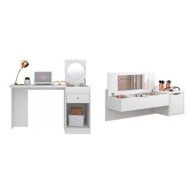 Escrivaninha Multifuncional com Espelho 1 Porta 1 Gaveta Capricho Esse produto é multifuncional, além de penteadeira pode ser utilizado também como escrivaninha de estudo. Com design moderno, ele possibilita acomodação de diversos pertences. Possui separador organizacional, 1 porta, 1 gaveta com corrediças . Espelho redondo incluso na porta basculante com pistão a gás. Produto de 15 mm com tampo de 25 mm e canto arredondado. Penteadeira Suspensa Camarim com Espelho Rouge Compacto, funcional e totalmente charmoso. O Camarim Rouge traz em sua composição, porta/tampo com pistão a gás e espelho, nicho com separadores organizacionais. Possui sistema de encaixe. Ideal para ambientes reduzidos.