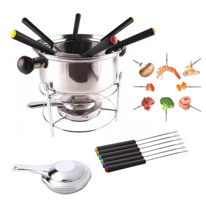 Conjunto Fondue Inox 10 Peças Doce Salgado Fruta Chocolate Queijo Carne Torrada Molho Outono Inverno
