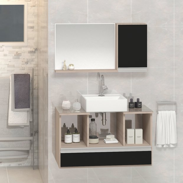 KIT BANHEIRO COMPLETO 80CM - GABINETE + CUBA + ESPELHEIRA + TAMPO VIDRO INCOLOR