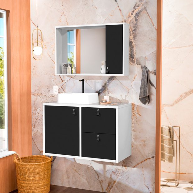 Conjunto Gabinete para Banheiro com Cuba Sobrepor, Tampo de Vidro e Espelheira Toro 80cm Branco/Preto