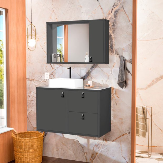 Conjunto Gabinete para Banheiro com Cuba Sobrepor, Tampo de Vidro e Espelheira Toro 80cm Grafite