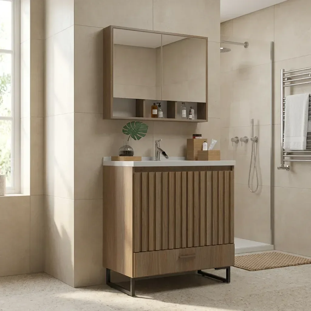 - Organização Inteligente: Otimize seu espaço com um gabinete espaçoso, que inclui uma gaveta grande e um amplo compartimento com portas. A espelheira complementa com prateleiras internas e um nicho inferior, ideal para seus itens de uso diário.
