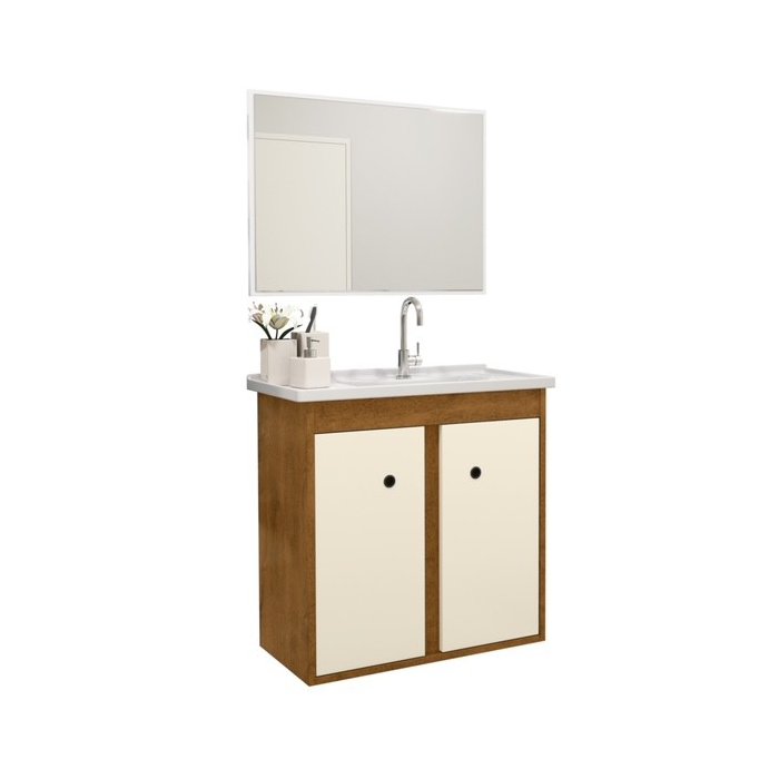CONJUNTO GABINETE PARA BANHEIRO PRISMA FREIJO/OFF WHITE 60CMO conjunto Gabinete para Banheiro com Cuba PRISMA é desenvolvido em estilo retrô com estrutura em MDP 12 mm, acabamento em pintura U.V. e com Cuba em mármore sintético, características que garantem mais durabilidade e resistência ao produto. Possui prateleira interna. Além disso tudo, o conjunto ainda acompanha um lindo espelho. Aproveite e adquira já o seu conjunto para deixar o seu ambiente ainda mais charmoso e elegante.Características Gerais:- Acabamento : Pintura UV- Acabamento da Cuba : Pintura UV- Acabamento da Porta : Pintura UV- Acompanha Tampo : Não- Cor da Cuba : Branco- Cor do Produto : Corpo Freijo com portas em Off White- Cor Interna : Freijo - Formato do Espelho : Retangular- Material da Cuba : Mármore Sintético- Material Principal : MDP- Possui prateleira interna!- Acompanha Cuba- Não Acompanha Torneira- Produto Fixado na Parede- Acompanha Kit de Instalação- Produto montado, não necessita montagem- Peso : 17,500 kgDimensões do produto montado:- Altura: 61 cm- Largura: 59 cm- Profundidade: 32 cm- Medidas do Espelho (A x L x P) : 50cm x 35cm x 2cm- Medida da Cuba (A x L x P) : 4cm x 59cm x 32cm*Itens Inclusos : 1 Gabinete de Banheiro, 1 Espelho, 1 Cuba e Manual de Montagem*Recomendações de Uso, Manutenção e Limpeza : Limpar com pano levemente umedecido