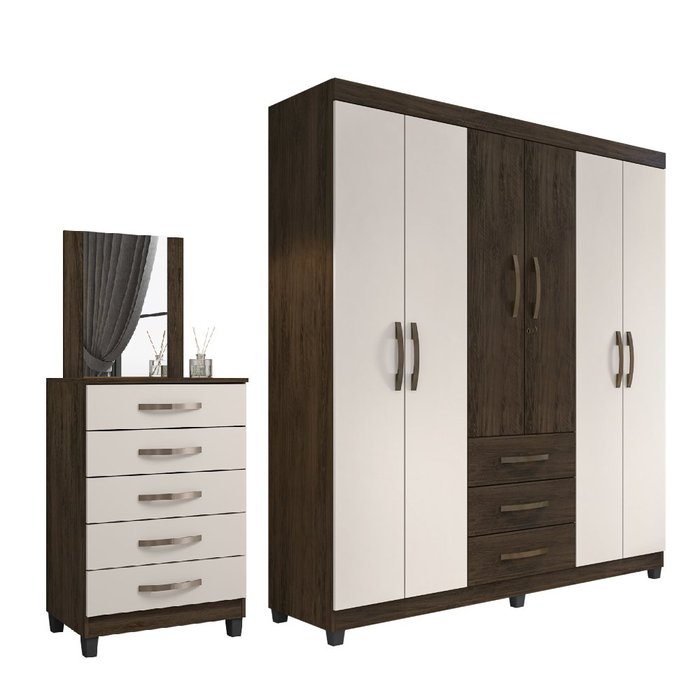 O Guarda Roupa possui 6 portas e 3 gavetas, com corrediças telescópicas, e cabideiros em alumínio. O destaque fica para a porta central do guarda roupa, que conta com chave garantindo privacidade e segurança para seus objetos