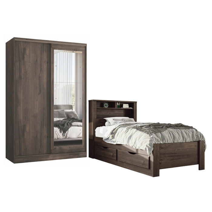 Conjunto Guarda Roupa Com Espelho e Cama Com Gavetas Aurora Ébano