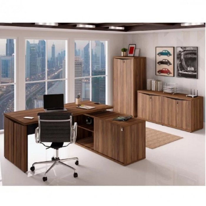 Com uma bela e espaçosa mesa em L, um armário e um balcão excelente para guardar inúmeros materiais, este é o conjunto perfeito para tornar seu escritório ou Home Office mais elegante e produtivo!