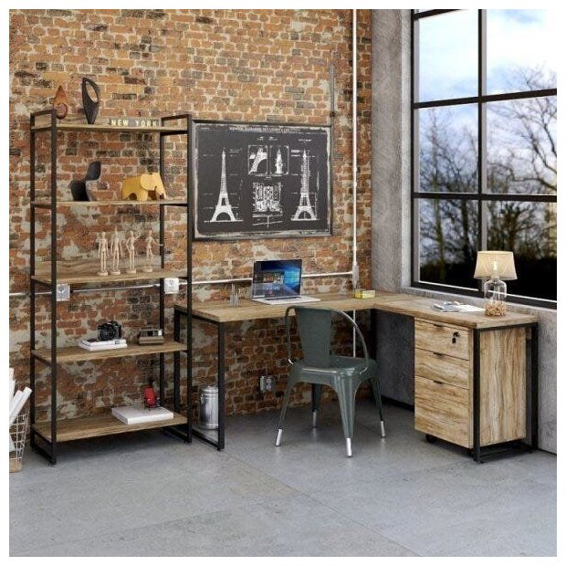 O conjunto Home Office é composto por 3 peças, sendo uma escrivaninha, uma estante e um gaveteiro. A linha Kuadra tem seu design com inspiração no estilo industrial, que remete muito a decoração utilizada nos lofts das grandes metrópoles nos anos 60 e 70. Harmonizando o metal e os tons de madeira, foram projetados móveis versáteis e com estilo, que podem compor ambientes flexíveis e cheios de personalidade. Suas estruturas são fabricadas em aço, com soldas suavizadas e pintura texturizada epóxi-pó, conta com pés niveladores de altura e parafusos na cor preta. Medidas Escrivaninha 4966: 75x150x60cm (AxLxP) Medidas Estante 5018: 187x80x40cm (AxLxP) Medidas Gaveteiro 6169: 70,5x45,5x43cm (AxLxP)
