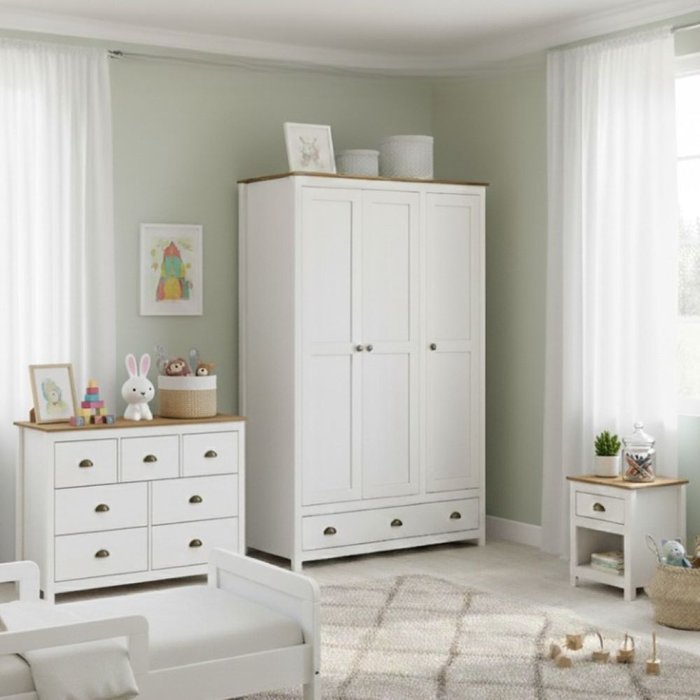 O conjunto é fabricado 100% em madeira maciça de pinus com acabamento em verniz PU/UV acetinado na cor Branco/Freijó. O guarda-roupa oferece organização para roupas e acessórios, a cômoda amplia o armazenamento com sete gavetas espaçosas, e a mesa de cabeceira complementa o ambiente com funcionalidade para o dia a dia. Um conjunto que une durabilidade, beleza natural da madeira e praticidade, ideal para deixar o quarto infantil mais organizado, charmoso e aconchegante.