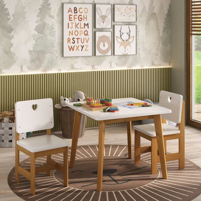 Conjunto Infantil Mesa com 2 Cadeiras Madeira Maciça e MDF Branco/Mel