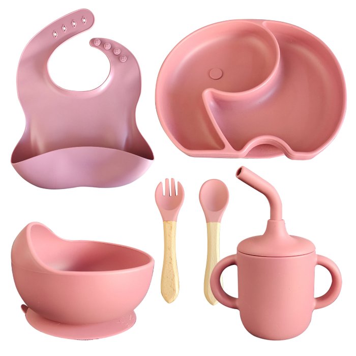 Conjunto Introdução Alimentar para Bebê de Silicone 6 Peças Prato Talheres Copo Bowl e Babador:vinho