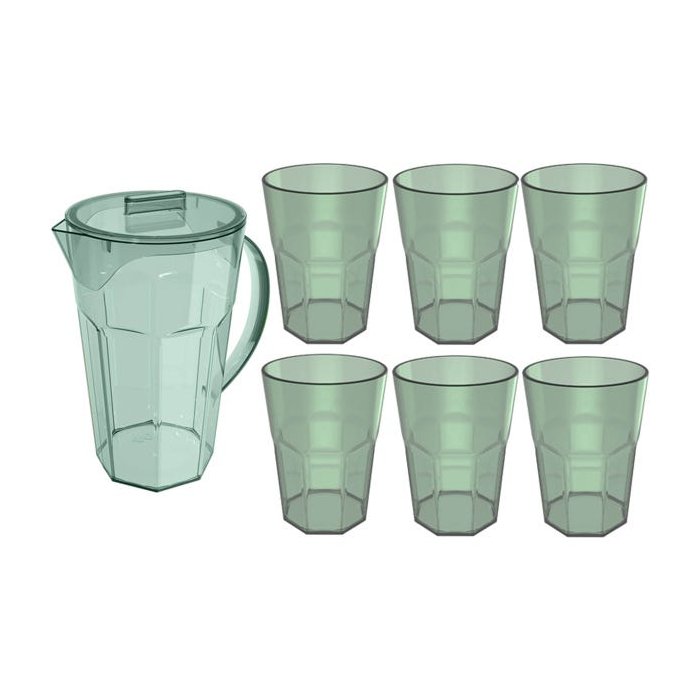 Sirva deliciosas bebidas com mais praticidade. Com o jogo de copos com jarra servir bebidas na temperatura que você deseja ficou mais fácil. A jarra de suco com tampa para proteger a bebida, conta com capacidade de 1,8 litros, evita derramar e facilita a dosagem ao servir. Os copos são perfeitos e versáteis no momento de levar bebidas a mesa. O conjunto de jarra e copos é ideal e pode servir água, sucos, refrescos, chás, nas reuniões com amigos e familiares ou em outras ocasiões.