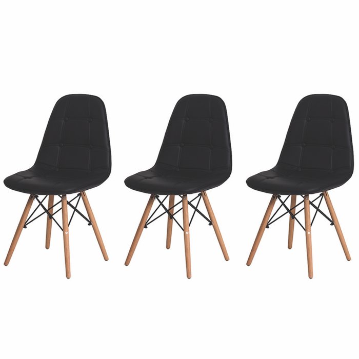 Conjunto Kit 3 Cadeiras Estofadas Charles Eames Botonê Preto com Base Madeira Preto