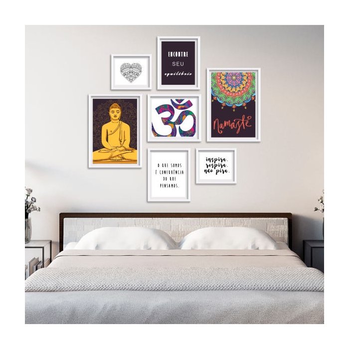 Conjunto Kit 7 Quadros Buda Encontre seu Equilíbrio Com Frases Moldura Branca - Oppen House Quadros