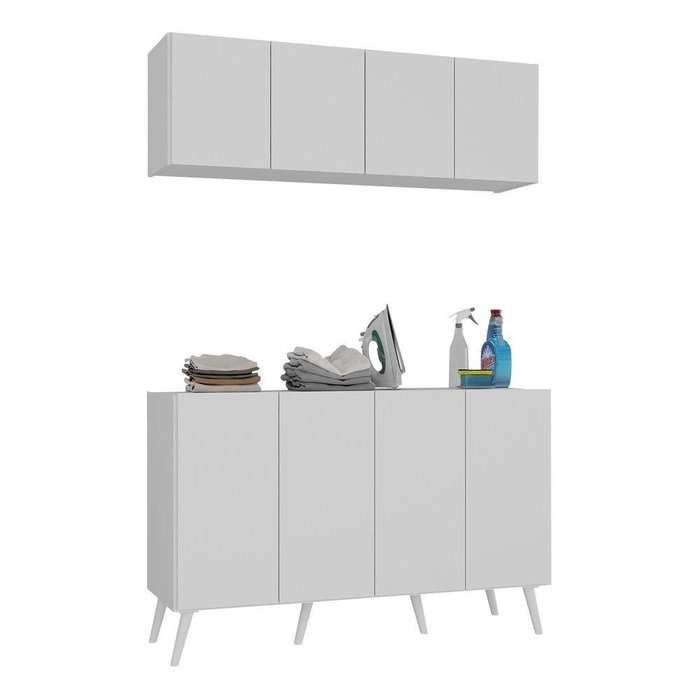 Conjunto Lavanderia Retrô Multiuso Armário Aéreo e Balcão Mp5053 Branco Branco Branco