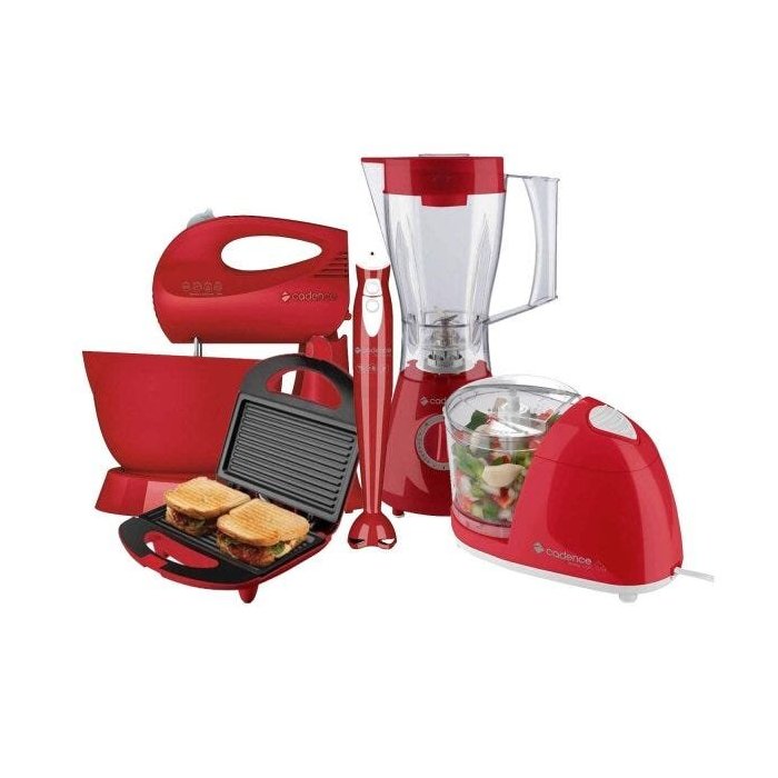 Conjunto Liquidificador, Batedeira, Sanduicheira Minigril, Mini Processador e Mixer Colors 220V Cade Vermelho