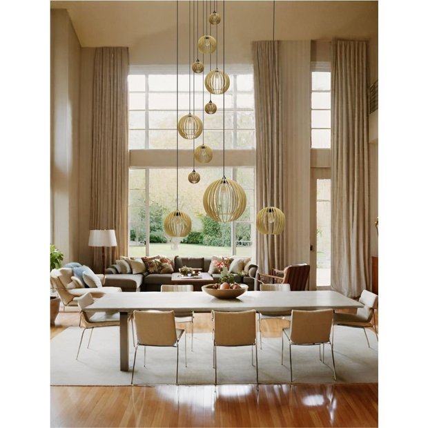 O lustre é composto por 2 pendentes Ball de altura 37 cm e diâmetro 42cm, 2 pendentes Mini Ball altura 26 cm e diâmetro 28 cm e mais 4 pendentes Micro Ball com altura 15 cm e 18 cm de diâmetro. Cabos ajustáveis com soquete do tipo E27 e canopla em madeira de 64 cm de diâmetro com linda mandala ao centro. Tamanho ajustado, aproximadamente 4,3 metros. Diâmetro do conjunto 80 cm.