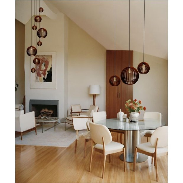 O lustre é composto por 2 pendentes Ball de altura 37 cm e diâmetro 42cm, 2 pendentes Mini Ball altura 26 cm e diâmetro 28 cm e mais 4 pendentes Micro Ball com altura 15 cm e 18 cm de diâmetro. Cabos ajustáveis com soquete do tipo E27 e canopla em madeira de 64 cm de diâmetro com linda mandala ao centro. Tamanho ajustado, aproximadamente 4,3 metros. Diâmetro do conjunto 80 cm.