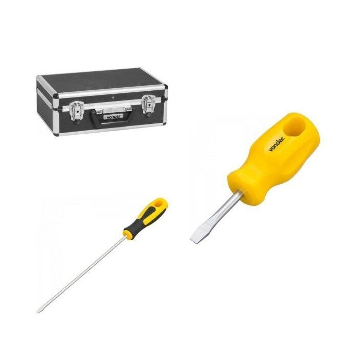 Produzida em aço cromo vanádio, proporcionando maior resistência e durabilidade. Possui acabamento niquelado que confere maior resistência contra oxidação/corrosão. Conta com ponta magnetizada que facilita tanto a colocação quanto a retirada de parafusos em locais de difícil acesso. Cabo anatômico em polipropileno que garante maior conforto ao operador. Produzida em aço cromo vanádio, proporcionando maior resistência e durabilidade. Possui acabamento niquelado que oferece maior resistência contra oxidação/corrosão. Conta com ponta magnetizada que facilita tanto a colocação quanto a retirada de parafusos em locais de difícil acesso. Cabo anatômico em polipropileno revestido com borracha termoplástica que garante maior conforto ao operador. Produzida em alumínio com cantos plásticos e laterais reforçadas com cantoneiras de alumínio, conferindo maior durabilidade. Possui fechaduras e dobradiças metálicas com acabamento cromado e revestimento interno com material sintético macio (EVA). Conta com porta-ferramentas removível com 8 divisões.
