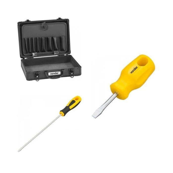 Possui estrutura rígida, revestida externamente em alumínio na cor preta, além de cantos plásticos e laterais reforçadas com cantoneira de alumínio, conferindo maior durabilidade. Revestida internamente com material sintético macio (eva), com porta-ferramentas removível e 2 fechos metálicos com chave. Capacidade de 3,5kg. Produzida em aço cromo vanádio, proporcionando maior resistência e durabilidade. Possui acabamento niquelado que confere maior resistência contra oxidação/corrosão. Conta com ponta magnetizada que facilita tanto a colocação quanto a retirada de parafusos em locais de difícil acesso. Cabo anatômico em polipropileno que garante maior conforto ao operador. Produzida em aço cromo vanádio, proporcionando maior resistência e durabilidade. Possui acabamento niquelado que oferece maior resistência contra oxidação/corrosão. Conta com ponta magnetizada que facilita tanto a colocação quanto a retirada de parafusos em locais de difícil acesso. Cabo anatômico em polipropileno revestido com borracha termoplástica que garante maior conforto ao operador.