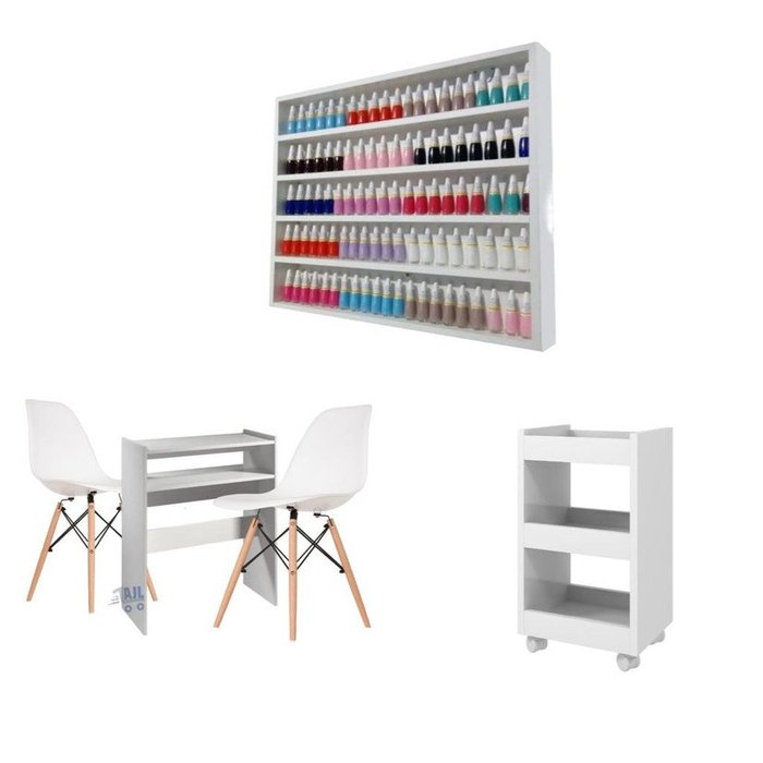 Conjunto Manicure Mesa + Porta Esmaltes Prateleira + 2 Cadeira Eames Branca + Carrinho Auxiliar AJL