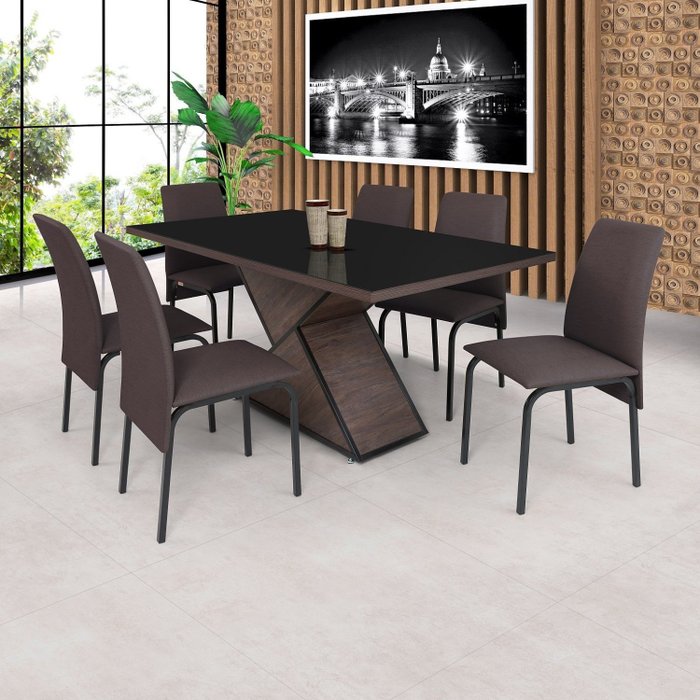 Conjunto Mesa 160x90cm Tampo Vidro 6 Cadeiras Barcelona