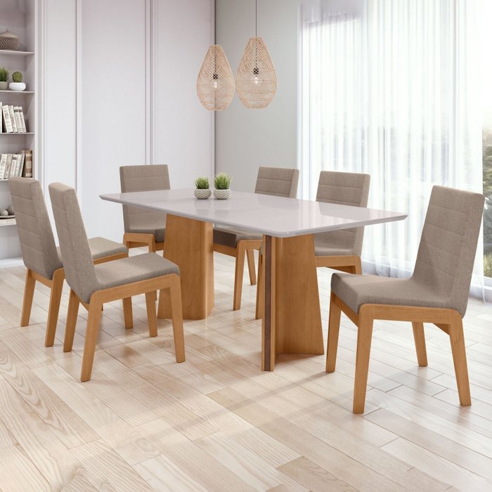 Conjunto Mesa 170cm Celina com Vidro e 6 Cadeiras Atla Amêndoa Clean/Off White/ Marrom