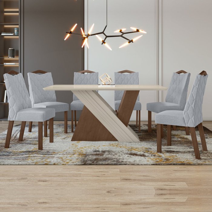 Conjunto Mesa 170cm Tampo MDF/Vidro 6 Cadeiras Vênus Móveis Lopas Imbuia Clean/Off White/Linho Cinza Claro