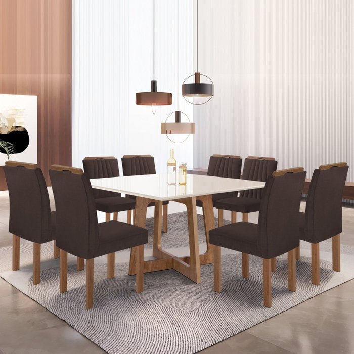 Conjunto Mesa Arizona 135cm com 8 Cadeiras Arizona Tampo Slim Plus com Vidro Chocolate/Off White/Marrom