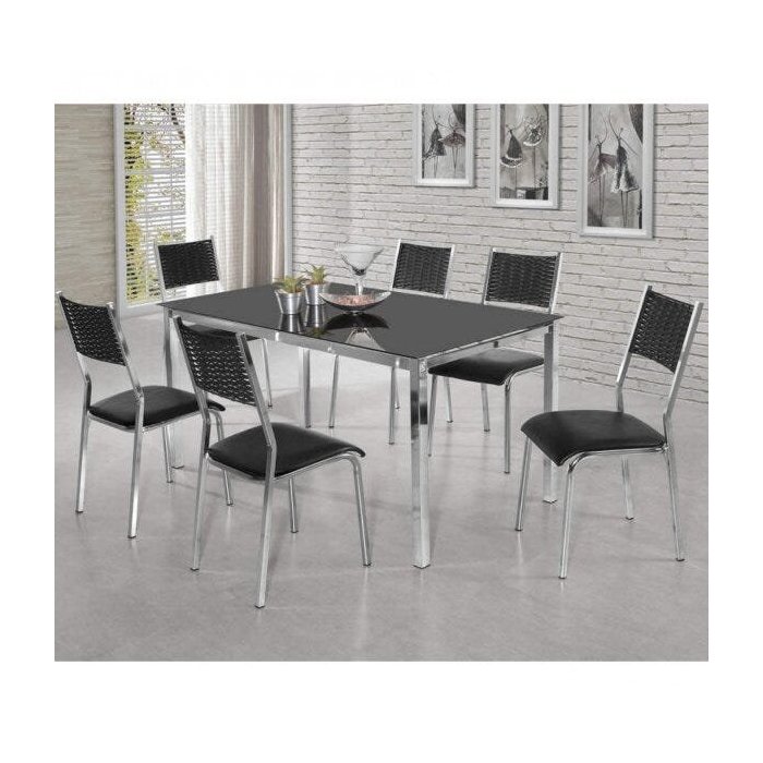 Conjunto Mesa com Tampo de Vidro Thais e 6 Cadeiras Sofia Aço Nobre Cromado/Preto