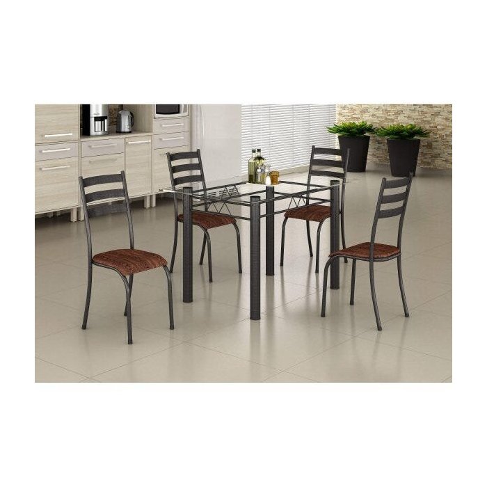 Conjunto Mesa com Tampo Vidro Retangular e 4 Cadeiras Madmelos Incolor/Prata/Tabaco