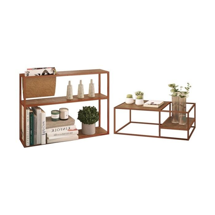 Conjunto Mesa de Centro e Mesa Lateral com Revisteiro Steel Quadra Vermont Base Cobre - Artesano